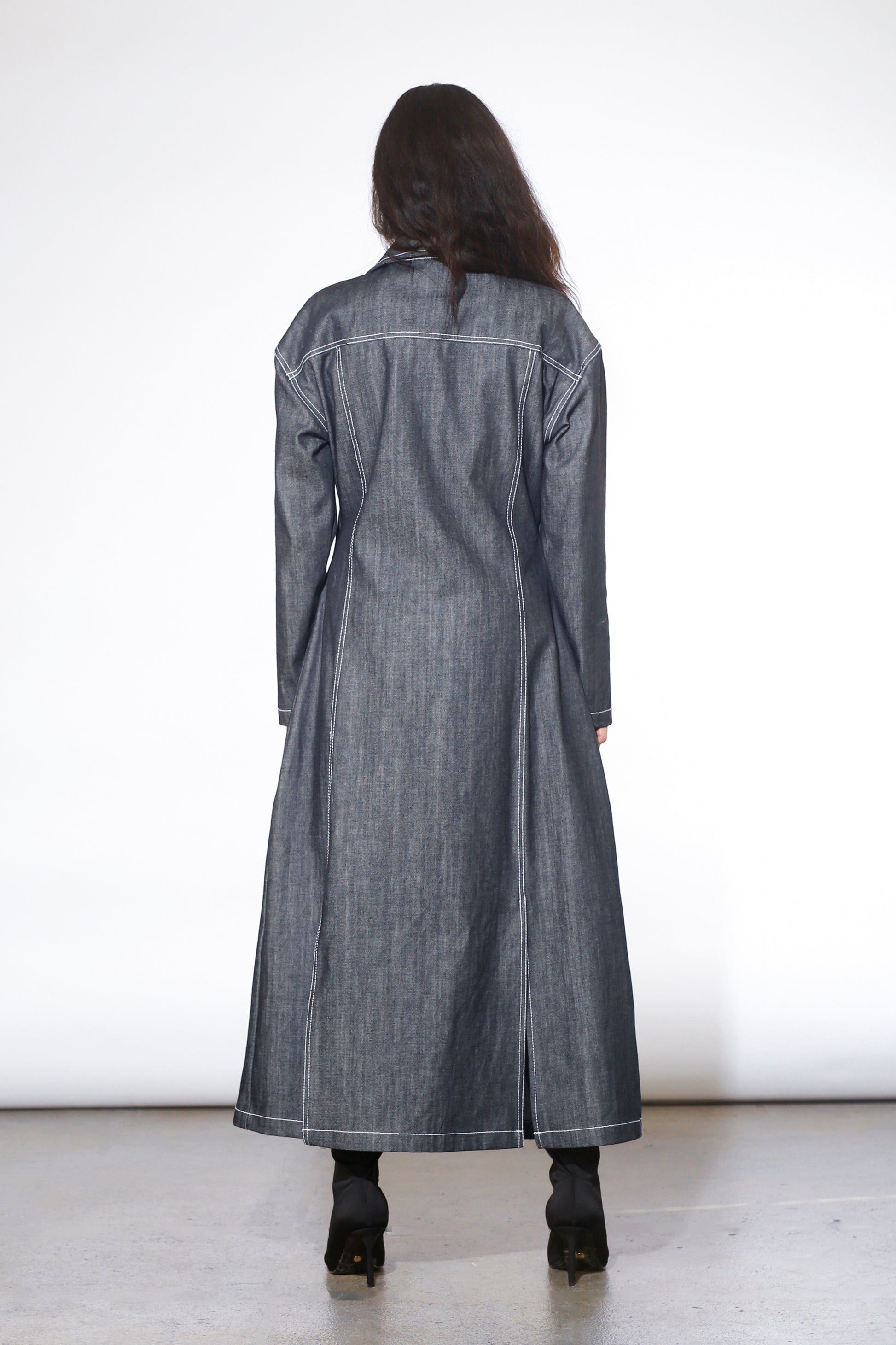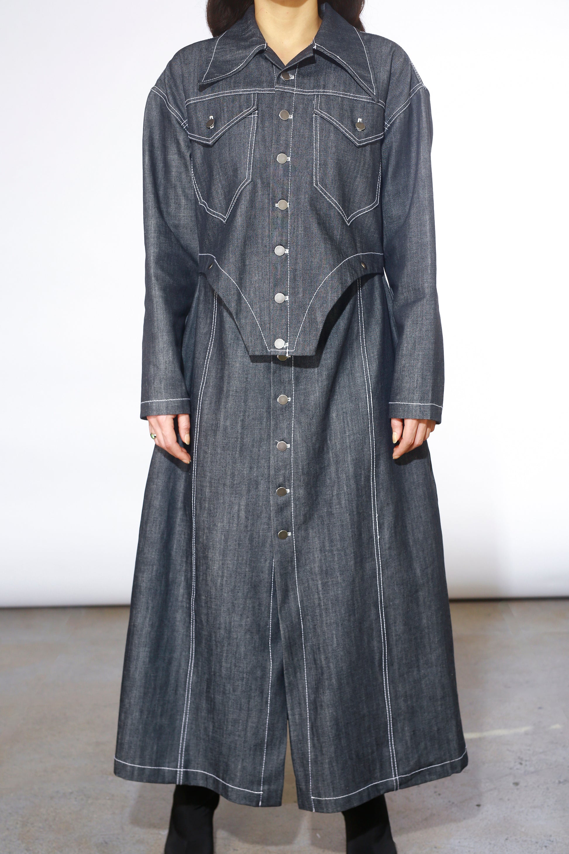 Versatile maxi dress crafted from deadstock raw denim. Garment is constructed as a 2-piece in front. Can be worn multiple ways: half-open to reveal a built-in skirt, fully closed, or fully open as a duster jacket.