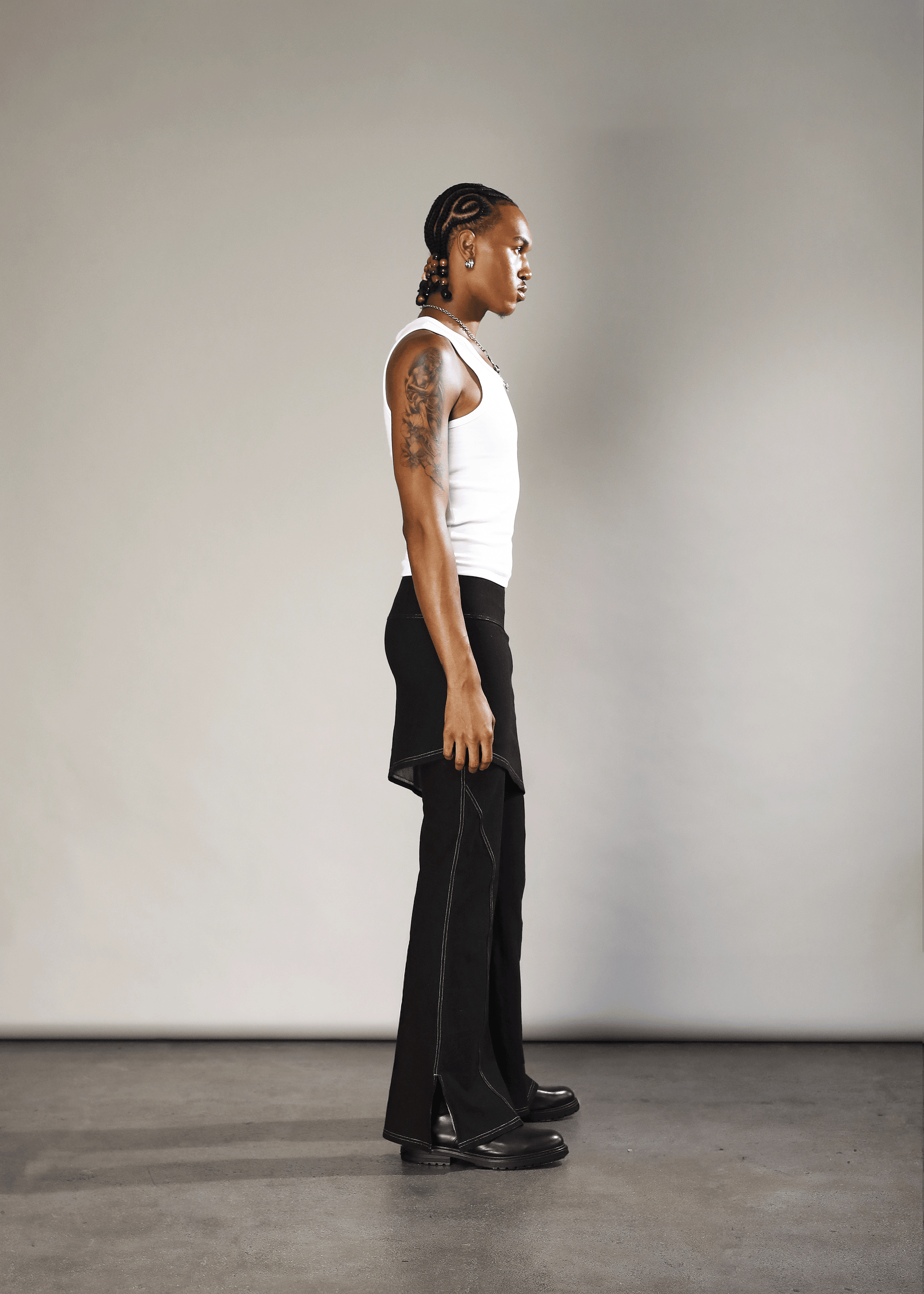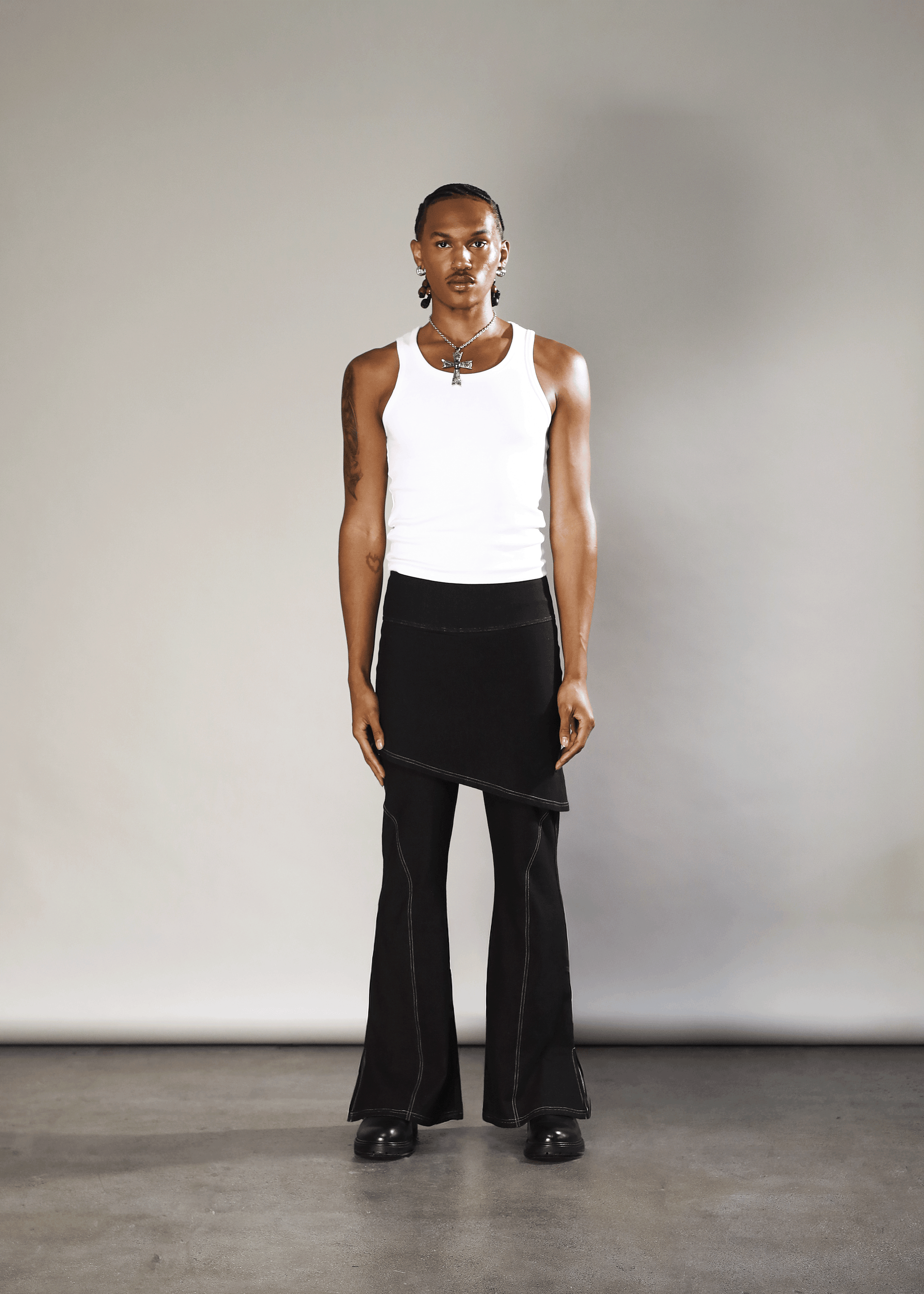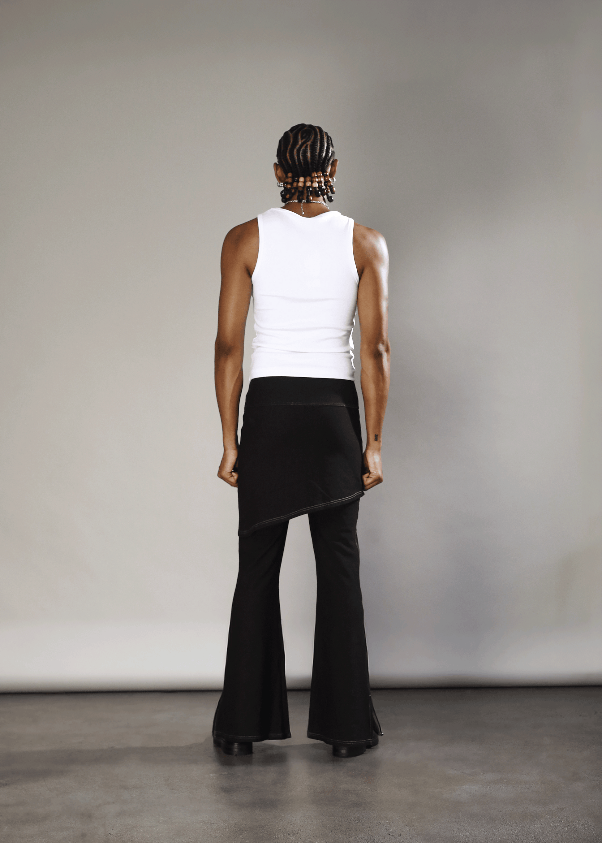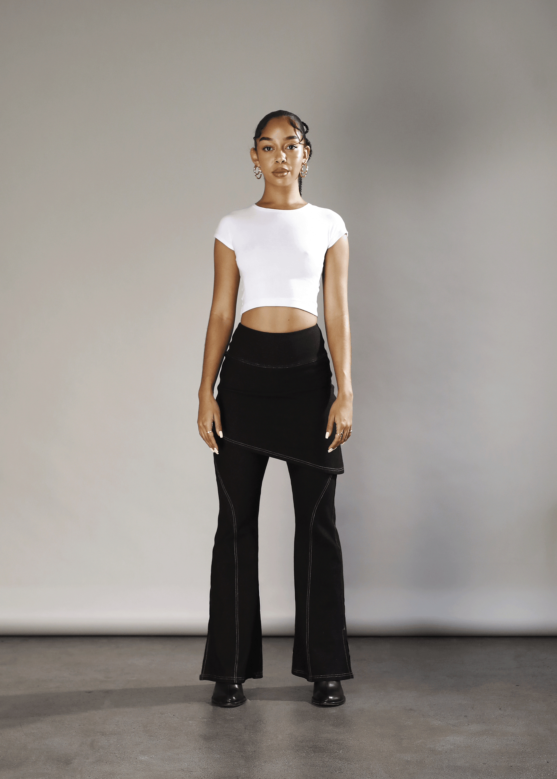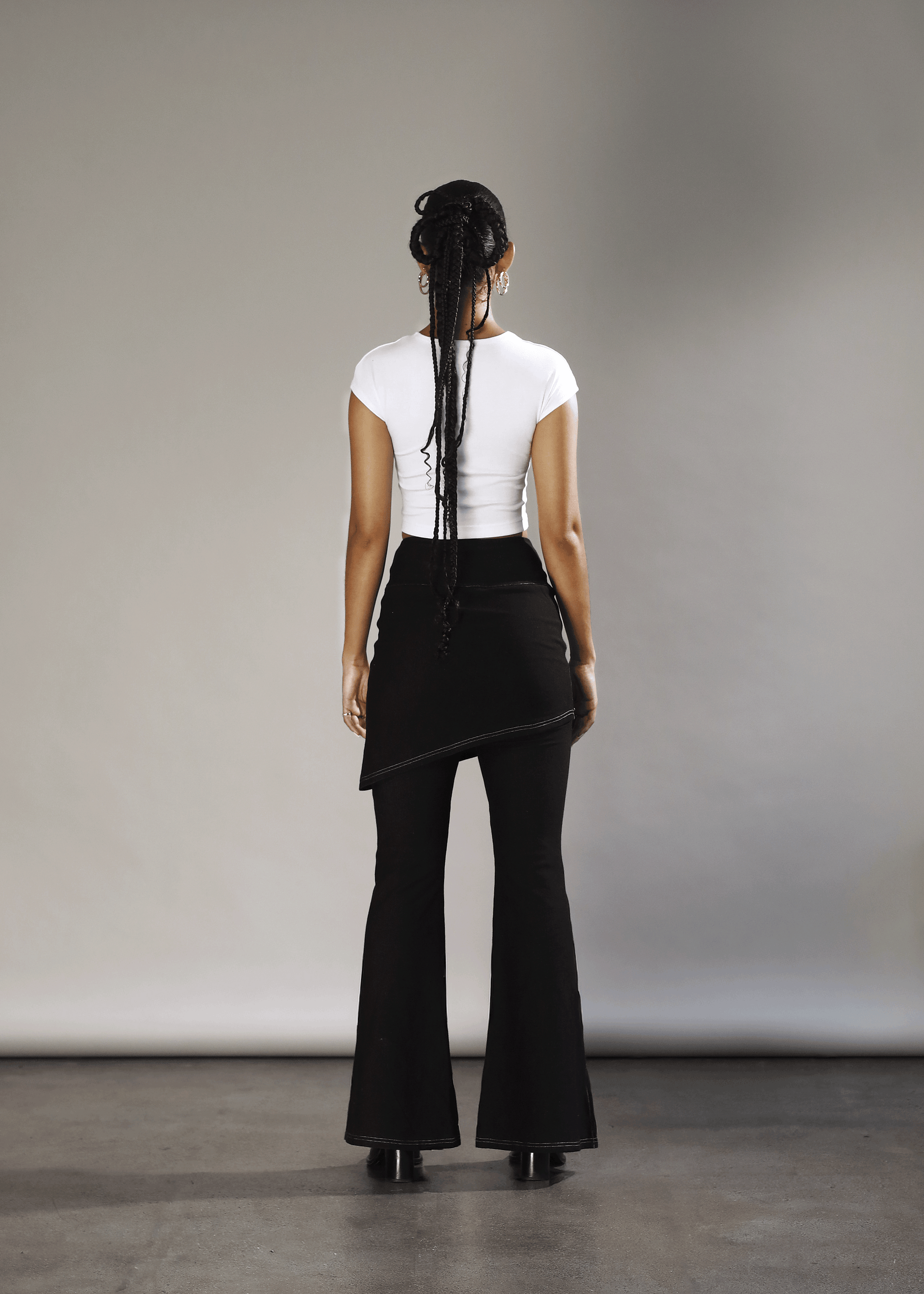 Faux denim slim-fit flare pants featuring an asymmetrical skirt detail. Contrast stitching accentuates the silhouette, while each pant leg has a stylish side slit.